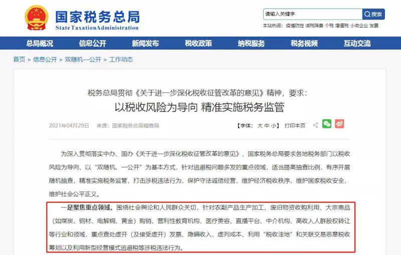 随后,国家税务总局发布来自国家税务总局稽查局的消息,明确2021年检查重点、检查方向和检查方式。